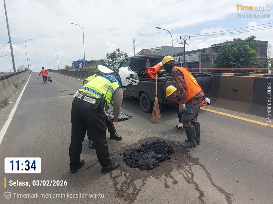 TANGERANGBERKABAR.ID – Di bawah terik matahari siang, Selasa (3/2/2026), sebuah pemandangan menyejukkan hati terlihat di atas Flyover Balaraja. Bukan sekadar meniup peluit atau mengatur ritme kendaraan, sejumlah personel Satlantas Polresta Tangerang tampak berjibaku dengan aspal dan sapu lidi. Mereka turun tangan langsung menambal lubang-lubang jalan yang selama ini menjadi “ranjau” bagi para pengendara.