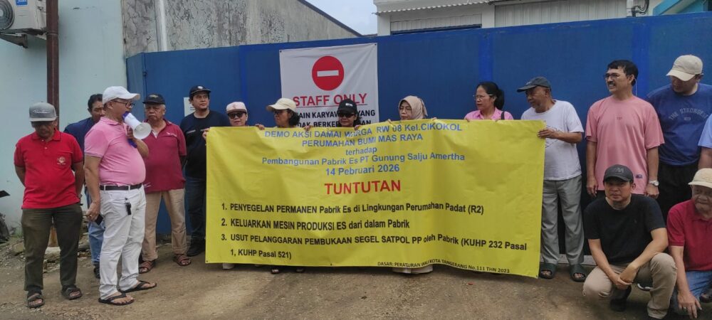 TANGERANGBERKABAR.ID – Suasana kawasan padat penduduk Perumahan Bumi Mas Raya RT 001 RW 008, Kelurahan Cikokol, Kecamatan Tangerang, mendadak memanas, Sabtu (14/02/2026). Warga turun ke jalan melakukan aksi unjuk rasa damai, menuntut pabrik es milik PT Gunung Salju Amertha yang berdiri di tengah lingkungan hunian segera ditutup total dan disegel permanen.