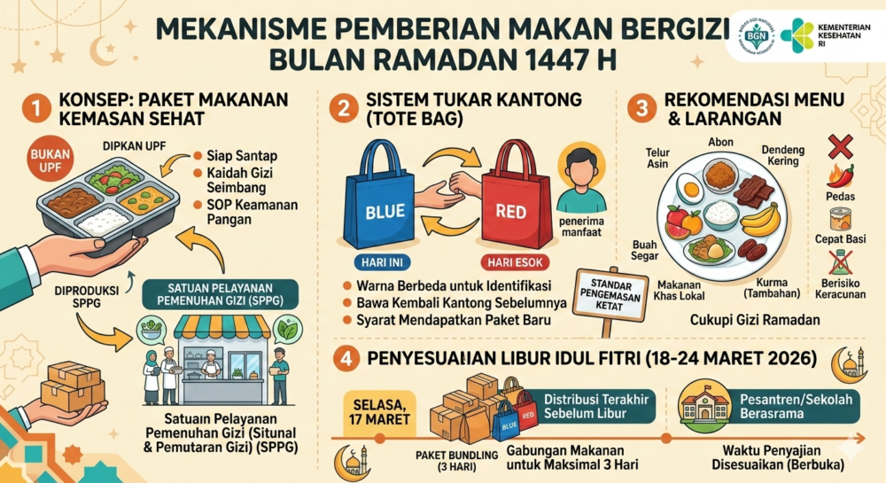 TANGERANGBERKABAR.ID, JAKARTA – Badan Gizi Nasional (BGN) menetapkan penyesuaian mekanisme pemberian makan bergizi bagi penerima manfaat yang menjalankan ibadah puasa melalui sistem “Paket Makanan Kemasan Sehat”. Kebijakan ini tertuang dalam Surat Edaran Nomor 3 Tahun 2026 guna memastikan pemenuhan gizi tetap berjalan efektif selama bulan Ramadan 1447 H.